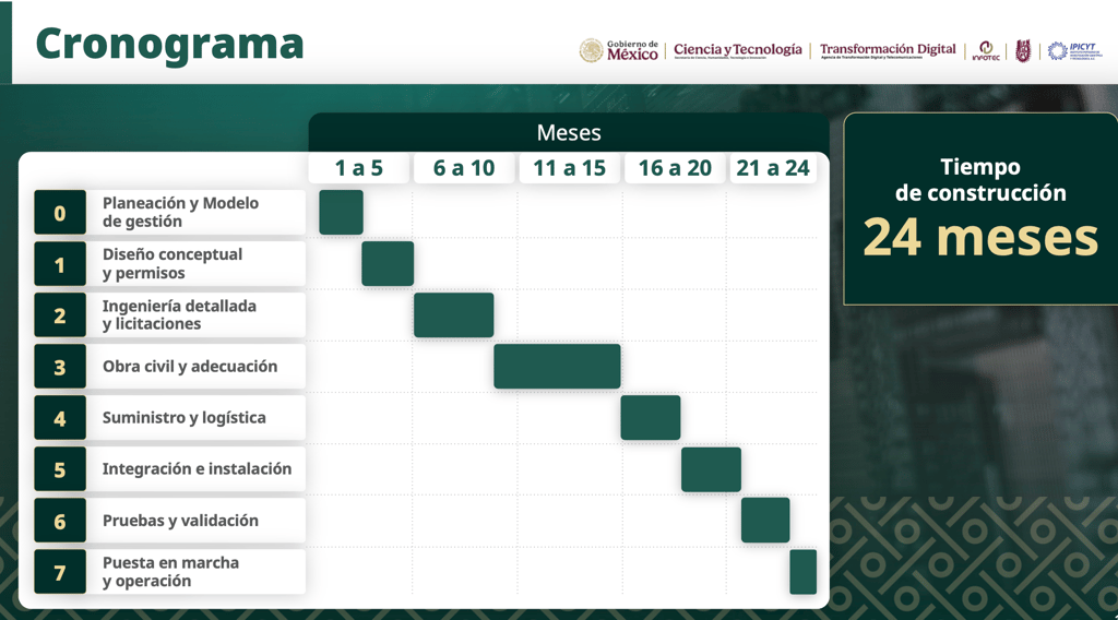 El proyecto de Coatlicue tomará 24 meses desde su inicio en 2026. El proceso implica el diseño conceptual, la ingeniería, las licitaciones, la obra civil, la instalación de equipos, la integración y las pruebas.