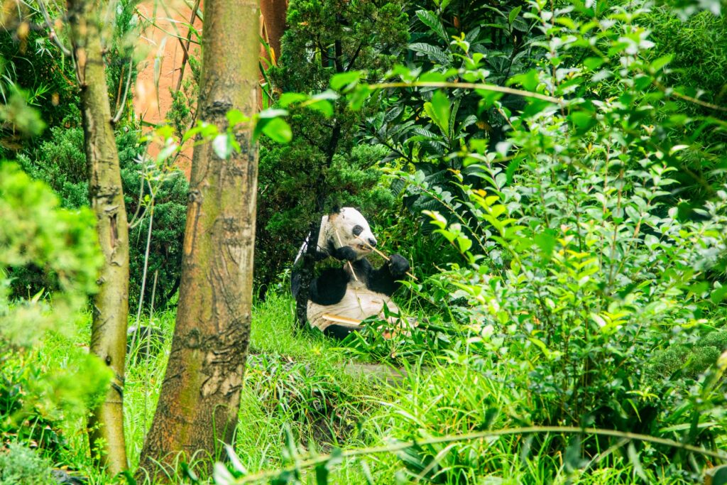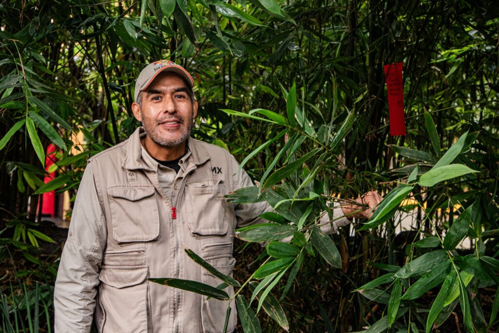 Cada mañana, Elías llega al hábitat de la panda gigante para hacerle una revisión ocular. Verifica que esté en condiciones adecuadas, ya sea para un chequeo médico, para darle su alimento preparado por los nutriólogos o una de las cuatro o cinco raciones de bambú que consume al día.