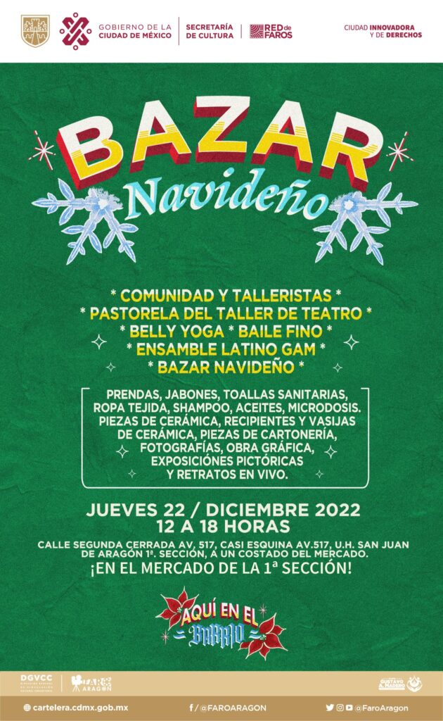 La cita para irte a comprar y ver todo lo que habrá en el Bazar Navideño del Faro de Aragón es este jueves 22 de diciembre. El horario irá de las 12:00 p.m. a las 6:00 p.m.