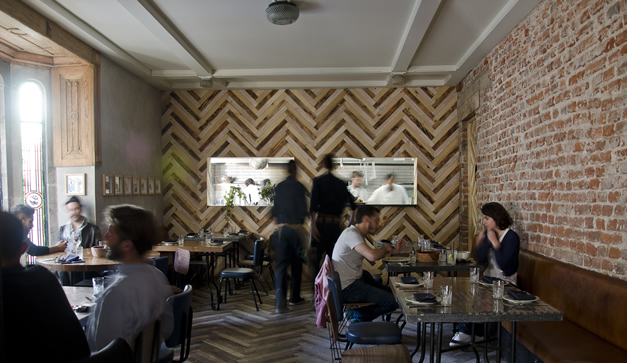 Para que todos los elementos se integren armónicamente en este coctel bar, la decoración y el mobiliario son agradables, en azul y madera oscura, luz tenue, techos bajos y con espejos manchados que dan un toque antiguo.