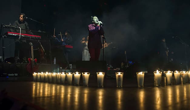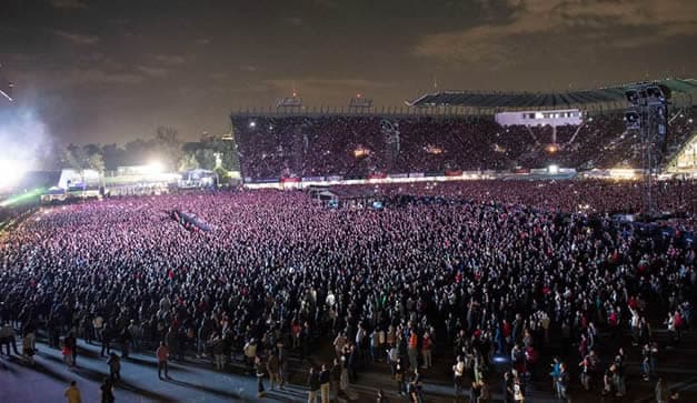 Pasaban las 8:40 de la noche cuando las luces del Auditorio se apagaron. El escenario, que albergaba un armazón metálico —que irónicamente parecía un pequeño Palacio de los Deportes— y tres pantallas, fue de súbito tomado por los músicos…