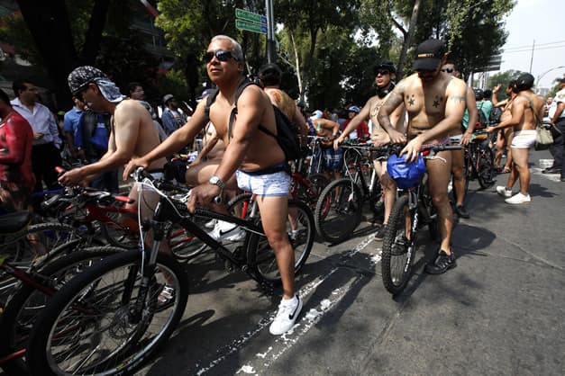Algunos completamente desnudos, otros, con dibujos en sus partes, otros más con ropa interior y el resto, disfrutando del espectáculo que dio la caravana de ciclistas que piden el respeto de los automovilistas, con los que comparten las calles…