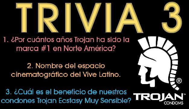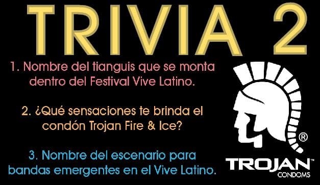 ¿No tienes boletos? Chilango.com y Trojan, el condón oficial del Vive Latino, te regalan boletos dobles para el domingo 30 de marzo. Sé uno de los 3 primeros en contestar correctamente la trivia. 1. ¿Por cuántos años Trojan ha sido…
