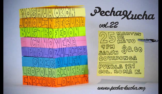 Pecha Kucha (el nombre) es una derivación de un termino japonés que se utiliza para decir cuchicheo. Este evento es un espacio donde se trata de mostrar el trabajo de jóvenes artistas involucrados con el diseño, el arte y…