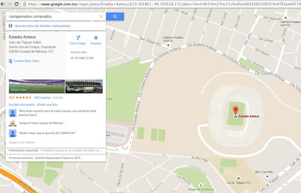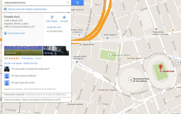 Google Maps es muy, muy sabio. Ayer les comentábamos que si escribías en el buscador de este servicio “subcampeonísimo”, inmediatamente te dirigía al Estadio Azul, la casa del Cruz Azul. Ahora bien, si escribes “campeonatos comprados”, ¿qué creen que…
