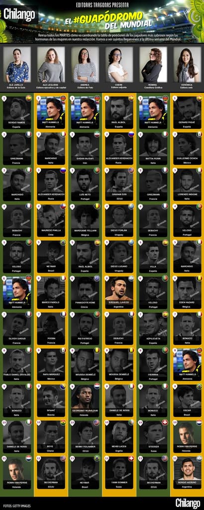 Dejando aparte su desempeño con el balón, la alineación femenina del equipo Chilango ha dado a conocer hoy su 11 ideal de galanes que les endulzan la pupila en la Copa del Mundo. Muy a su pesar, algunos de…