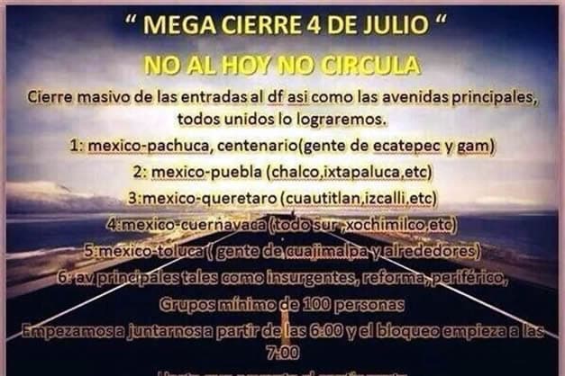 Algunas organizaciones que están en contra de las nuevas medidas del “Hoy no circula” han difundido una imagen donde convocan a un bloqueo en cinco accesos carreteros al DF y en tres de sus principales vías: Insurgentes, Reforma y…