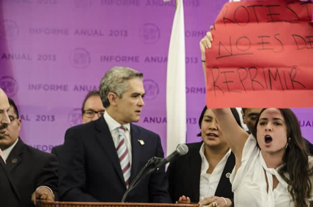 Unos 20 jóvenes protestaron contra el jefe de gobierno Miguel Ángel Mancera justo cuando se rendía el informe de la presidenta de la Comisión de Derechos Humanos, Perla Gómez. Los jóvenes obligaron a Mancera a abandonar el lugar, llevaba…