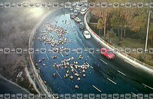 Un imprudente chofer de un camión de chelas tiró al menos 200 cartones sobre Circuito Interior a la altura de la Raza, en dirección hacia Aeropuerto. Foto: GDF Debido al caos, las autoridades chilangas realizaron cortes a la circulación…