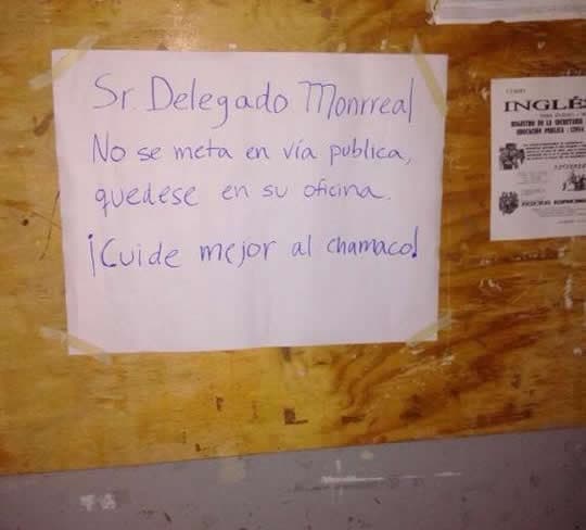 Ricardo Monreal, delegado de Cuauhtémoc, recibió amenazas a través de cartulinas pegadas en el edificio delegacional. “Delegado ya no le escarve (sic), no le haga al valiente. También se mueren delegados, el niño le hará mucha falta”, dice en…