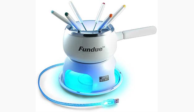 Fundue Por fin podrás difrutar un fondue sin tener que despegarte de tu queridisima computadora. Esta maravilla derrite queso y chocolate como lo haría un aparato normal, sólo que no necesita fuego real. Lo puedes encontrar aquí. Calentadores…