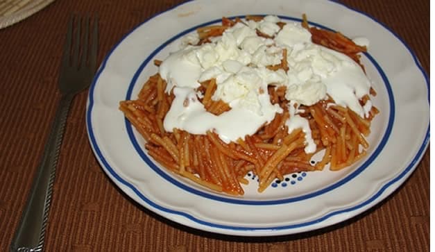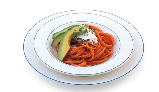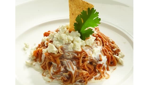 Con el toque del chef Daniel Ovadia. Los fideos secos vienen servidos en un gran plato blanco, con el timbal de fideos enchipotlados (pero no picosos al centro) y los aderezos alrededor: un poco de crema fresca, queso blanco…