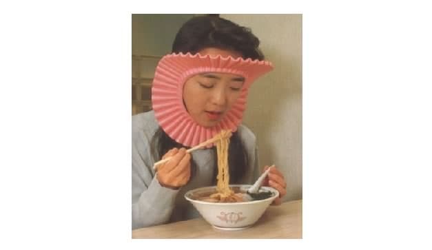 Nuestro último adminículo viene, nuevamente, de la imaginación nipona. Se trata de un sombrero en forma de flor que se coloca en la cara con el único propósito de no dejar caer el pelo en nuestra sopa de noodles….