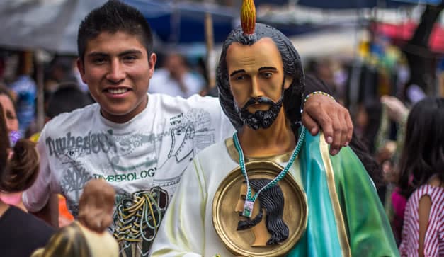 La fe mueve montañas y también mueve cuerpos. El 28 de cada mes en el entronque de las avenidas Hidalgo y Paseo de la Reforma se contonean suavemente con la cadencia del cumbiatón y el reguetón de moda de…