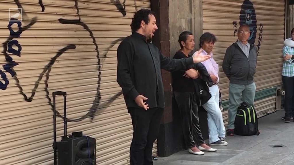 Una bocina, un celular con pistas pregrabadas y una copa para la propina del público. Eso es lo único que Luis Abram Ortega necesita para compartir su pasión por la ópera.