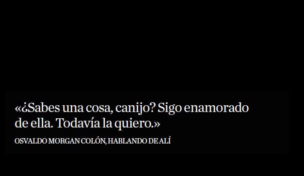 –¿Sabes una cosa canijo? Sigo enamorado de ella, –confiesa Osvaldo.–¿Todavía eran novios?–Estábamos por terminarlo.–¿Cómo era Alí?–Bastante dominante, un energúmeno: tenías que saber de los temas que tocaba en cuestiones filosóficas.–¿Eras celoso, posesivo con ella?–¡No! Si le permití tener una…