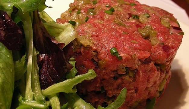 ¿Cómo va?Es un revoltijo de carne cruda (habitualmente carne molida de res) con cebollay vegetales como cilantro, alcaparras y perejil. Se prepara con jugos de limón,anchoas, aceite de oliva y ajo también. La consistencia te puede sacar de onda,pero…
