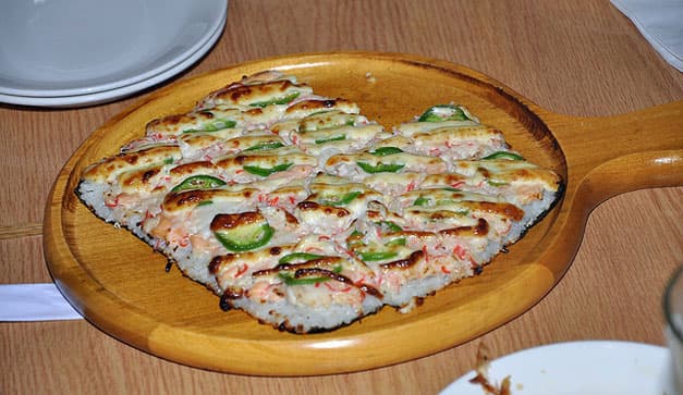 ¿Qué es? Que no se piense que esta pizza sustituye el pepperoni por rollos de sushi. Es mucho mejor. ¿Por qué la probaríamos? Las mujeres tienen una idea vaga de que el comer sushi engorda menos. Como nosotros no…