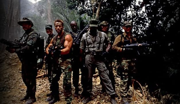 ¿Quiénes salen? El Governator, Carl Weathers, Jesse Ventura Momento más machín… Es difícil escoger una escena entre un comando guerrillero que combate un alien. Es como elegir la escena más candente de una peli porno. Así que elegimos una…