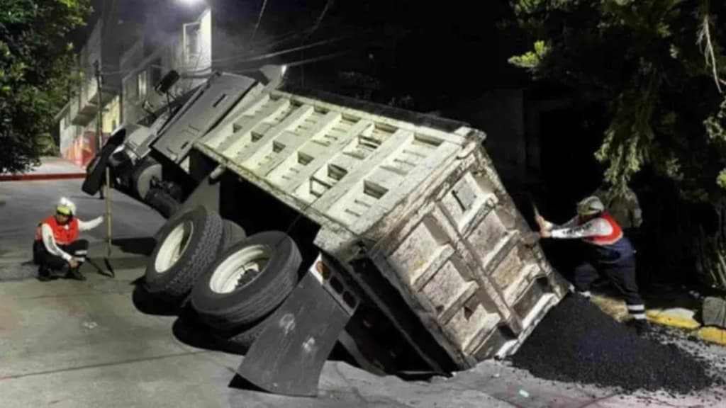 Dos socavones se abrieron en calles de la alcaldía Iztapalapa. En uno de ellos, un camión que transportaba chapopote quedó atorado.