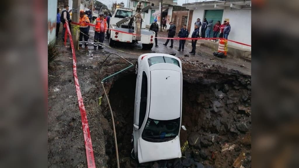 Así quedó un automóvil que cayó en un enorme socavón en la colonia Pedregal de San Francisco, de la alcaldía Xochimilco, de la CDMX.