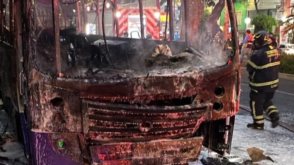 Unidad de transporte público de la CDMX se quema en Coyoacán. El hecho movilizó a bomberos y servicios de emergencia la tarde del 1 de marzo.