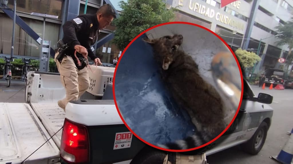 Así fue el rescate de un cacomixtle que merodeaba por las instalaciones de la SSC en la CDMX. Presenta pulgas y otros problemas de salud.