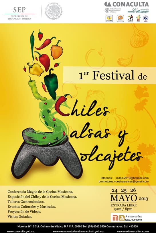 El Festival chiles, salsas y molcajetes se realizará en el Instituto Nacional de Antropología e Historia (INAH) el 24, 25 y 26 de mayo de las 11am a las 8pm. Habrá degustaciones, talleres gastronómicos, conferencias, proyección de videos de cocina mexicana, música,…