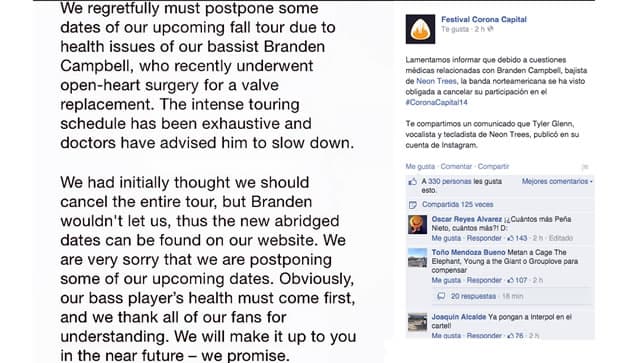 Es una lástima informarles que la banda norteamericana Neon Trees, canceló su presentación en el Corona Capital 2014. En un comunicado posteado en su cuenta de Instagram, Tyler Glenn, vocalista y tecladista, anunció que Branden Campbell tiene problemas de salud…