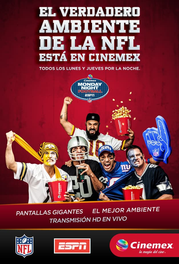 Si eres fan del futbo americano y te late la experiencia de verlo casi como en el estadio, lánzate cada lunes y jueves a una sala de Cinemex y disfruta de la transmisión en vivo y en HD en…
