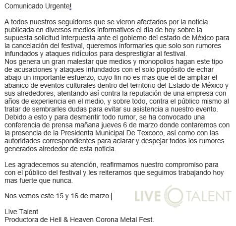 CUARTA ACTUALIZACIÓN: Este sábado 8 de marzo, los organizadores del Hell and Heaven Fest anunciaron que están en pláticas con el DF y zonas aledañas para llegar a un acuerdo y por fin mover la sede del evento. Mañana…