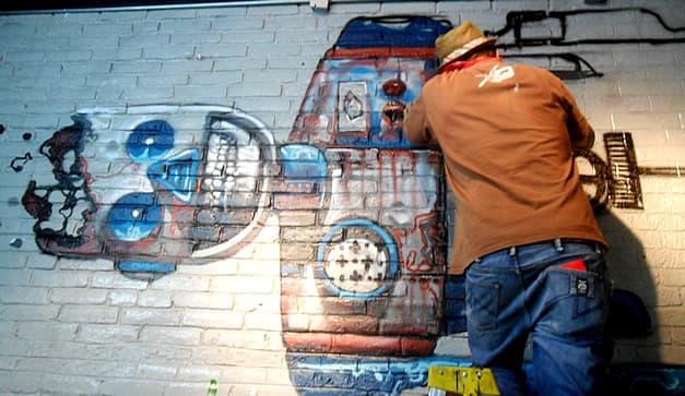 Lleva una hora y media pintando sobre el muro gris de la tienda Lemur de la Roma. Está montado sobre una escalera y con frecuencia intercambia botes de pintura en aerosol que mantiene sobre una tarima. Sube y baja…