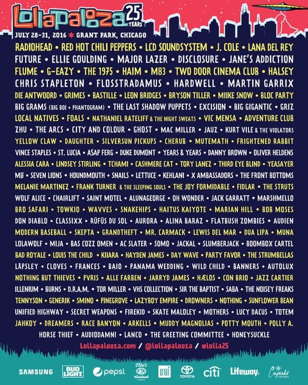 Del 28 al 31 de julio, el festival de música Lollapalooza estará festejando 25 años con el siguiente cartel. Si puedes, lánzate a Chicago a vivir la experiencia. También lee: 6 Conciertos para los que debes ahorrar en abril…