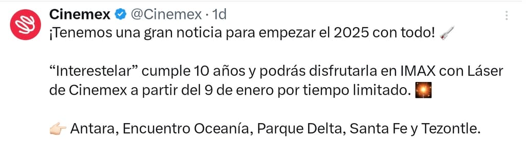 Por su parte, esta tarde se anunció el reestreno de Interstelar en Cinépolis, igualmente en sus salas IMAX a partir del 9 de enero.