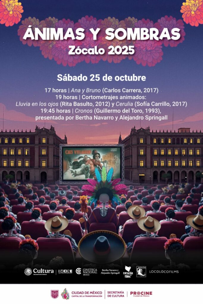 El Zócalo se transformará en una enorme sala de cine con la proyección gratuita de “Ánimas y Sombras 2025”. Entre las películas que se exhibirán, se destaca Cronos, el aclamado debut cinematográfico de 1993 del director mexicano Guillermo del Toro, uno de los consentidos del público.