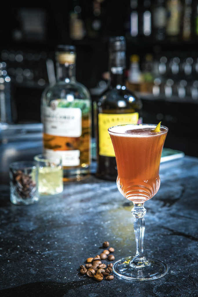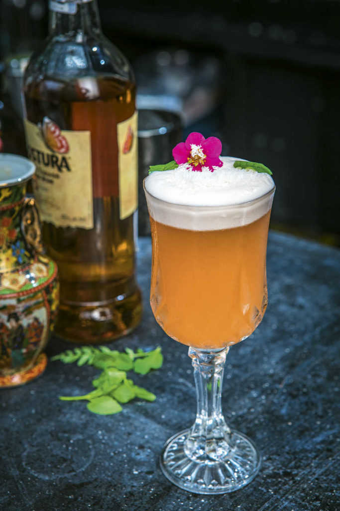 Nos preparó un trago con ron infusionado con coco, angostura, huevo, jarabe y zumo de lima.