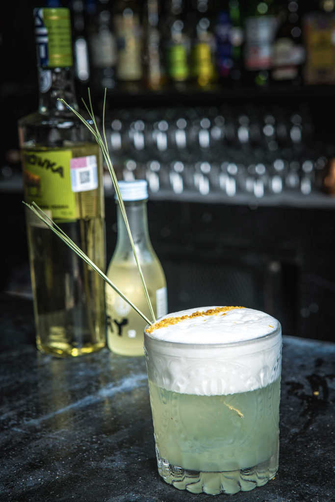 Nos preparó sour de sake con Zubrowka, jarabe de lemon grass y mix de cítricos, perfumado con lima limón.