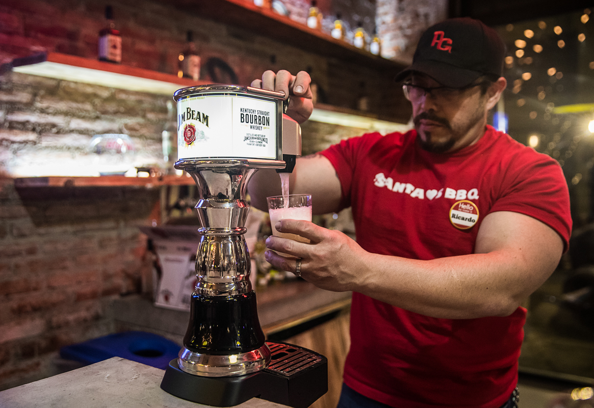 La cita fue en Pinche Gringo BBQ Polanco, donde los invitados pudieron probar por primera vez una nueva forma de tomar el Bourbon, gracias a la mezcla que genera esta máquina, que logra carbonatar el agua natural 1.5 veces más que la champaña, teniendo como resultado un agua mineralizada, lo que te da una sensación de frescura y burbujas en la boca.