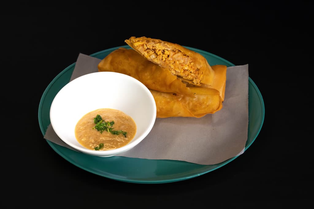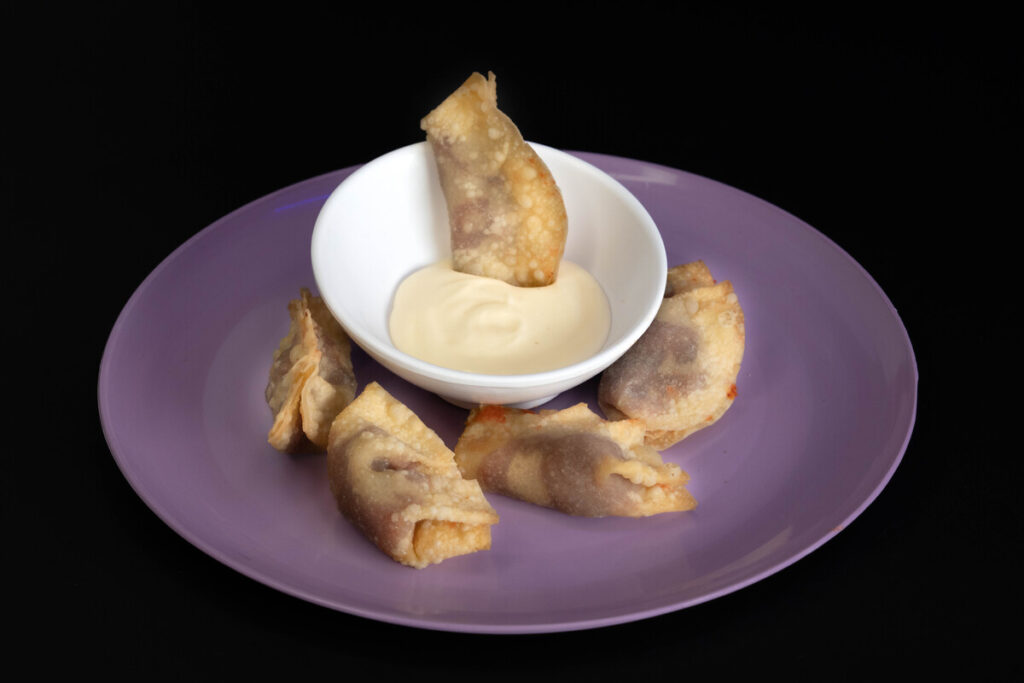 El postre inesperado son las gyosas rellenas de ate de membrillo, van fritas y servidas con salsa de queso.