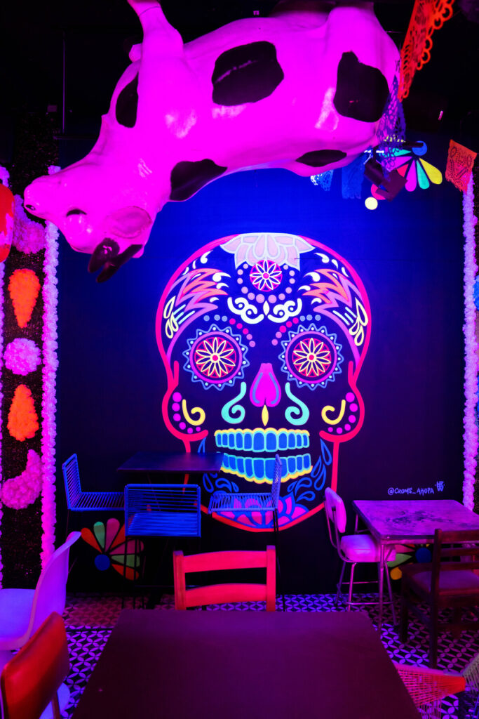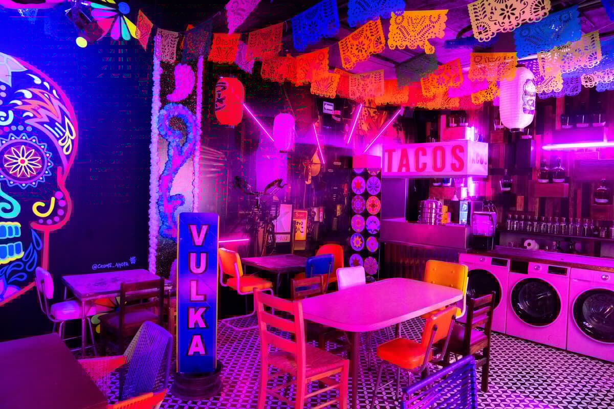 Entre la luz roja sobresalen los colores neón de la virgen de Guadalupe, una calavera, un tláloc y un letrero gigante que dice Tacos. Todo esto entre piñatas de burritos y banderitas de papel picado al lado de faroles chinos y japoneses. Al fondo de toda esta escenografía está el tesoro del lugar: las damajuanas que contienen mezcales únicos e irrepetibles.