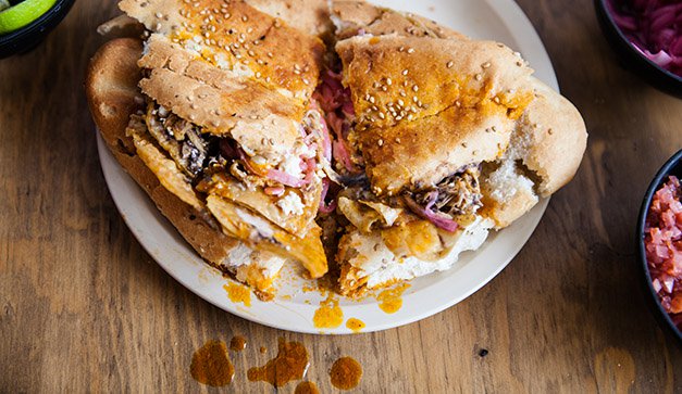 El paraíso de la cochinita pibil ofrece una maravilla: Torta Jumbo, con chilaquiles bañados en salsa roja de la casa,cochinita pibil, crema, queso fresco y cebolla morada. También los puedes pedir solitos o en panucho.
