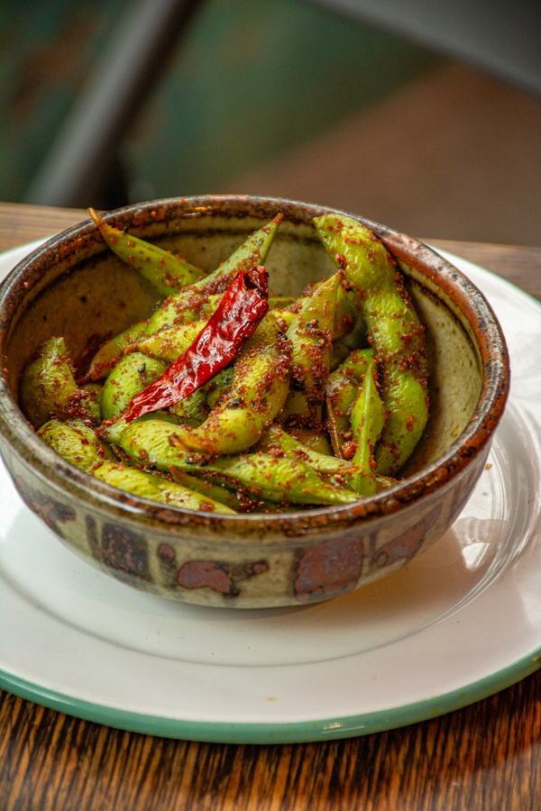 Empieza con unos edamames, estos tienen un chilito que es una bienvenida perfecta a esta cocina con toques mexas.