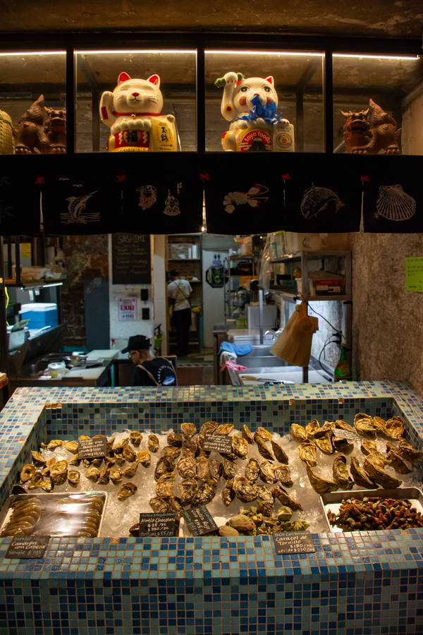 Desde la entrada notarás un pequeño mercado donde llama la atención la pescadería, con productos frescos muy socorridos en la comida japonesa: ostras, camarones, salmón, atún, pulpo. Observa cómo cortan los pescados y la calidad de cada uno.