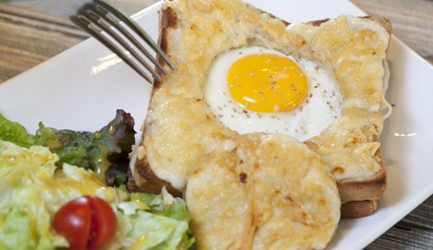 Para empezar el día pide el clásico Croque madame (pan francés con huevo, jamón, queso en pedacitos gratinado y ensalada) acompañado con un jugo de naranja natural.