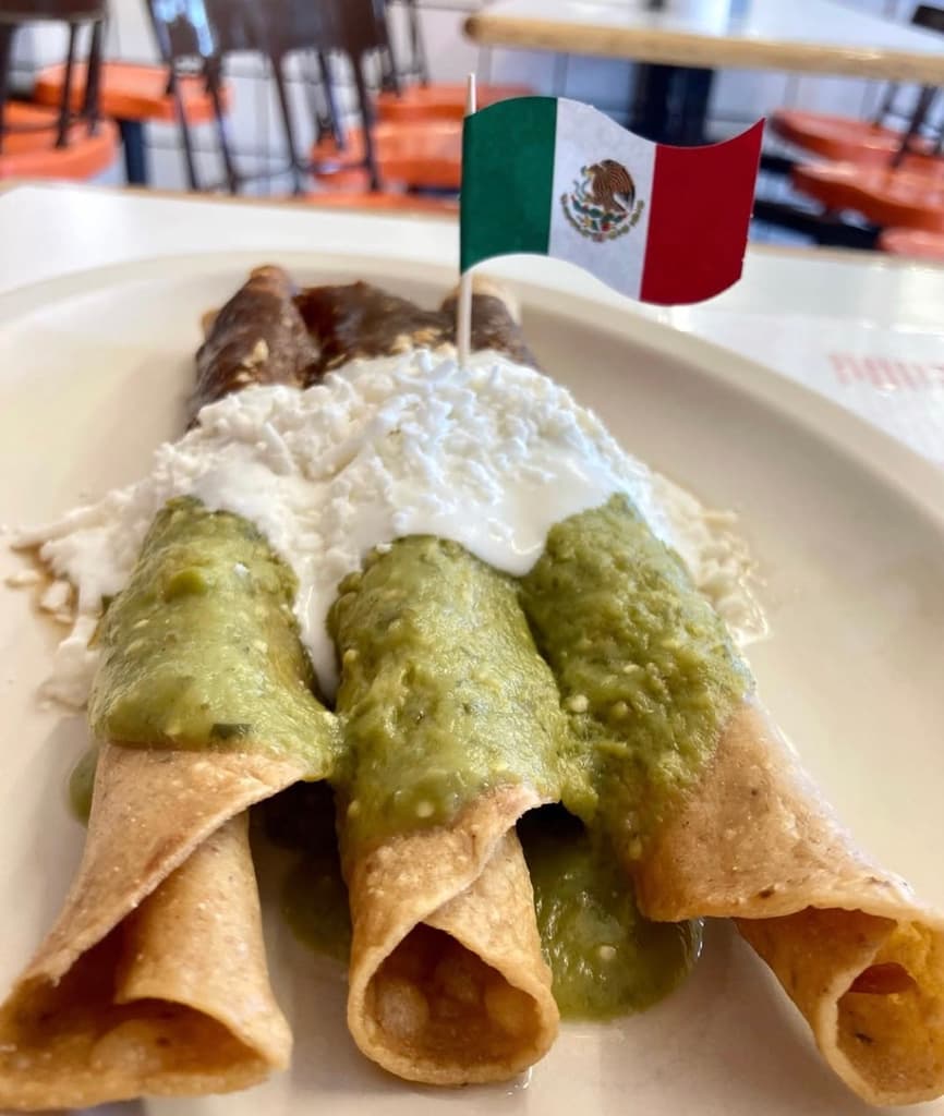Nombre bien puesto: flautas ahogadas en salsa verde caliente, coronadas con crema y queso cotija. La pieza ronda los 20 cm, rellena de pechuga de pollo deshebrada (25 g) y quesillo; salen calientitas y crujientes. Aquí la salsa manda: pica sabroso y se antoja repetir. Precio $30 por pieza o Combo de 3 y refresco de 355 ml por $160. De postre, la jugada es entre flan o plátanos fritos con crema.