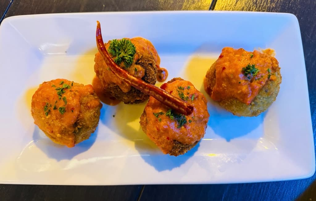 - Arancinis de risotto rellenos de champiñones, chícharos y queso, empanizados y fritos a la perfección