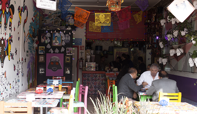 Además, el lugar tiene mucha ondita porque la decoración tiene estilo kitch pero auténtico ya que ningún diseñador lo planeó así. En realidad las dueñas tienen amigos artistas, grafiteros y realizadores que les han creado piezas originales para decorar el lugar a manera de exponer su trabajo y dejar un toque en el restaurante.