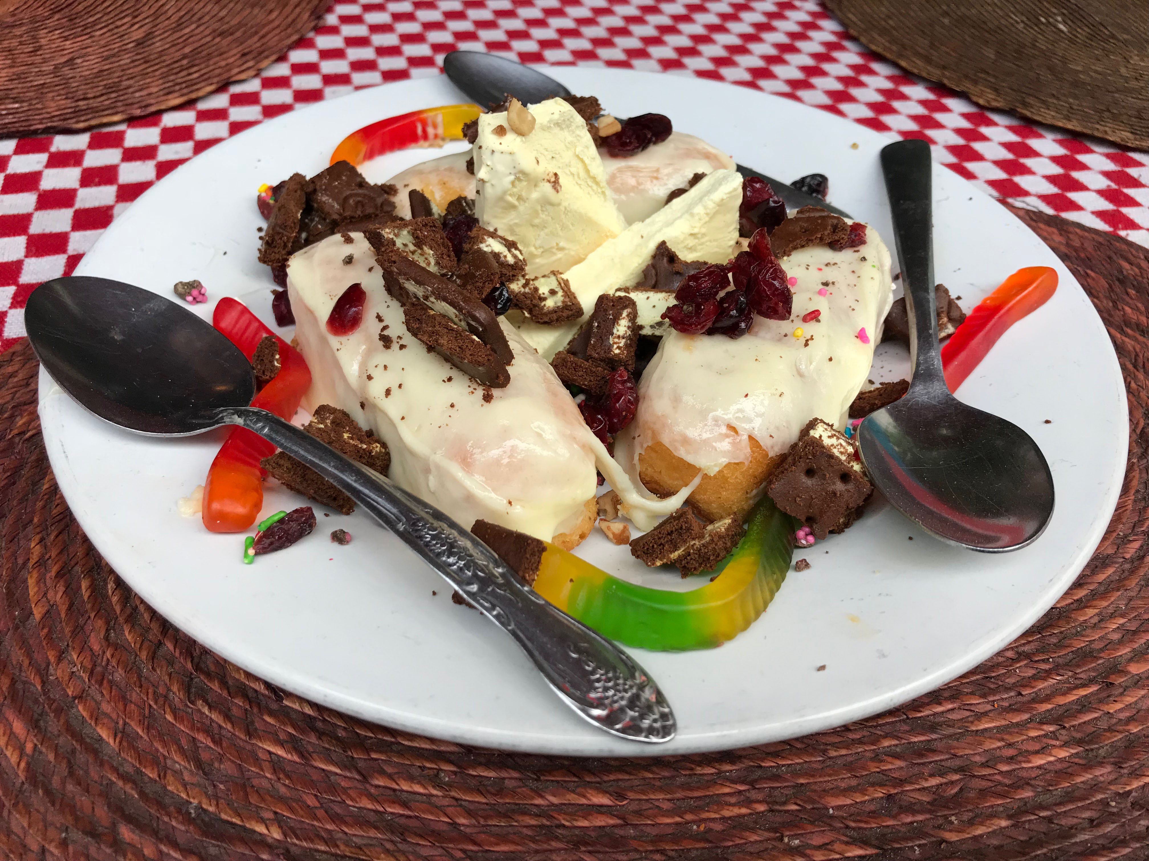 El postre es como diseñado por un pacheco en pleno monchis: tres Twinkys cubiertos con queso tipo mozzarella, arándanos, nueces y chispitas de colores, más una bola de helado. Es decir, algunas de las cosas más antojables de la tiendita en un solo plato.