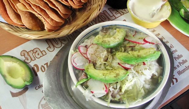 Complementos: rábanito, cebolla, lechuga, crema, tostadas y una salsa roja demezcla de chiles, picosa, sabrosa y deliciosa. Levanta crudos.