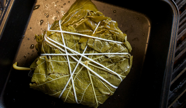 Envuelve el queso brie entero en hojas de parra y amárralo. Colócalo en una parrilla y ahúmalo en fuego indirecto por 20 minutos. Mientras asa las nueces de la india hasta que tengan un ligero tostado. Para servir, desenvuelve el queso, córtalo y sírvelo con nueves de la india recién tostadas brevemente en el asador.